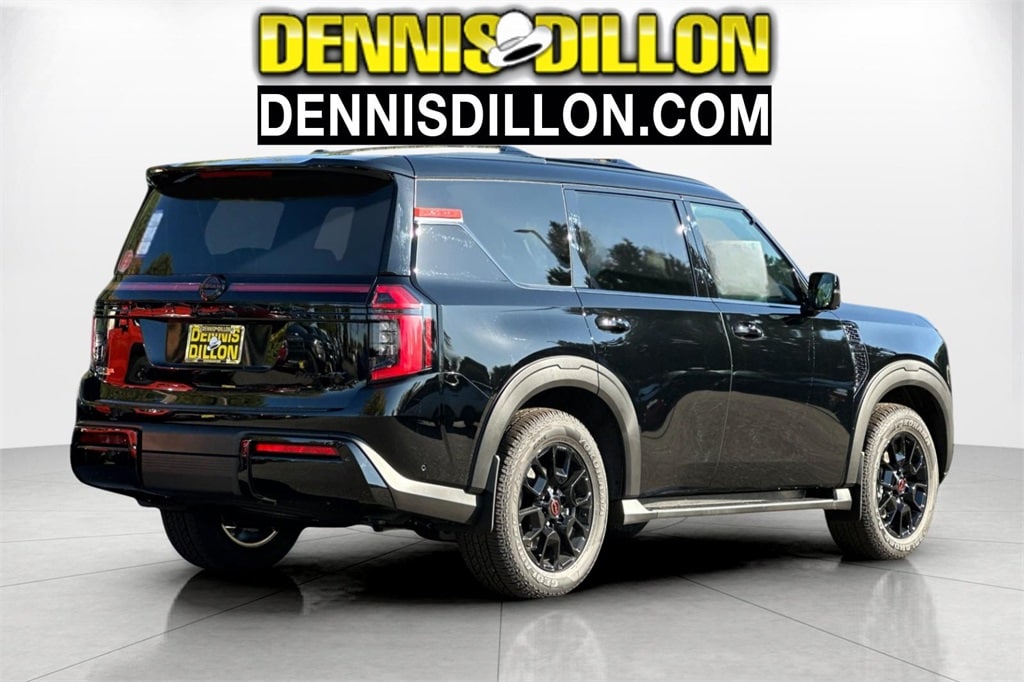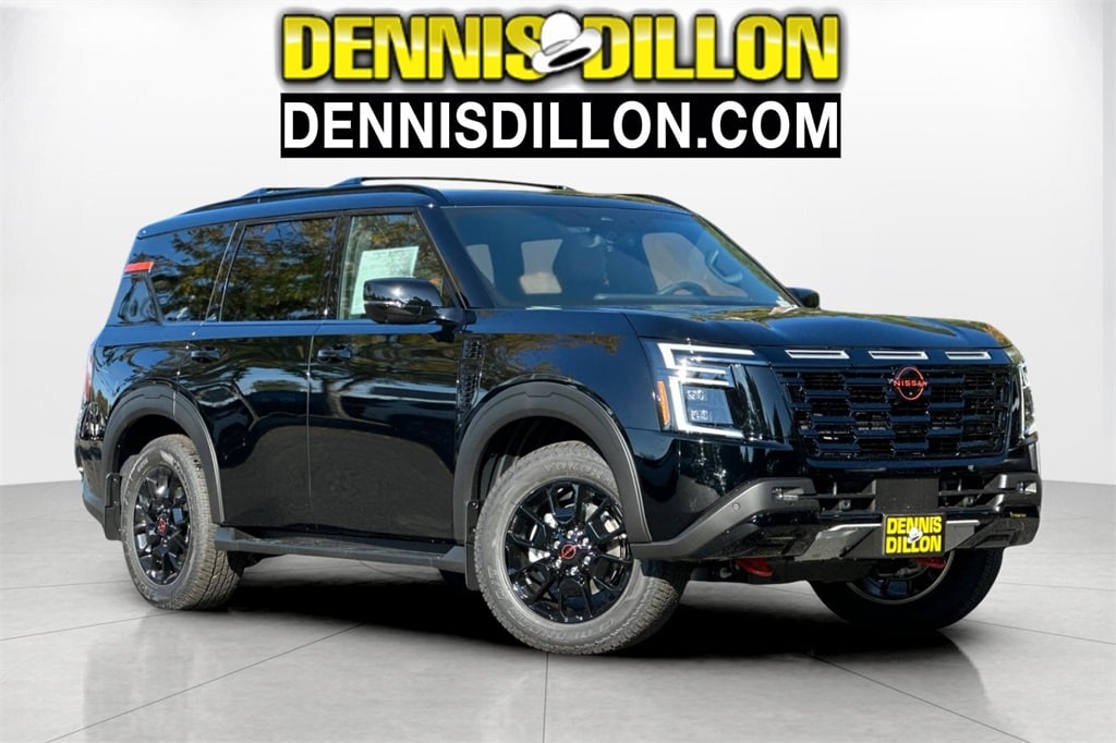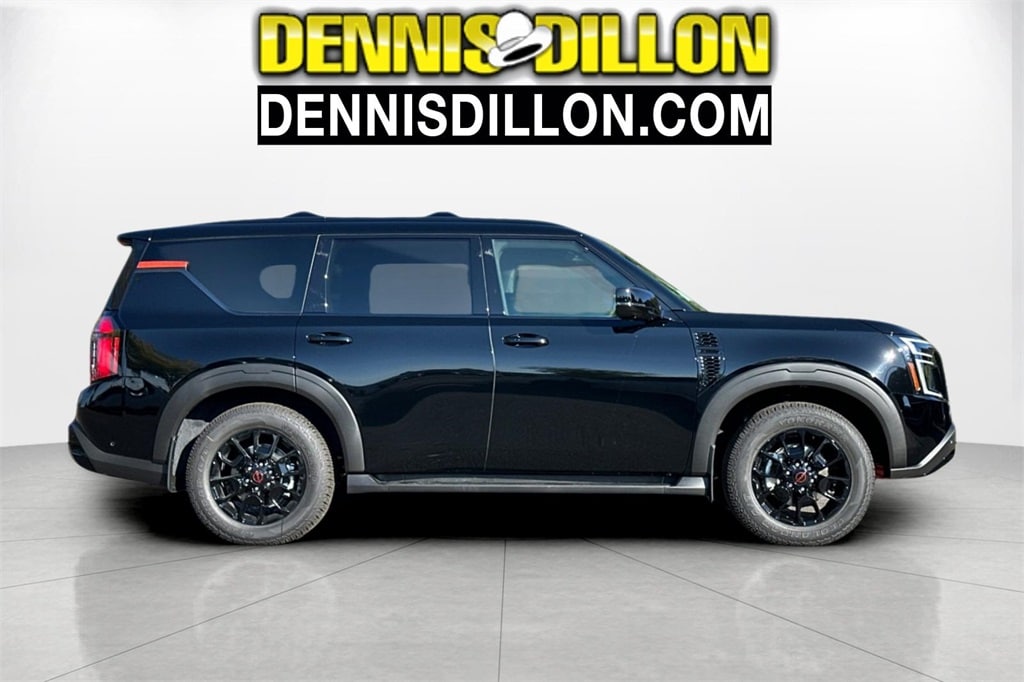 Super Black 2026 Nissan Armada PRO-4X 4D Sport Utility 4WD 9-Speed Automatic 3.5L DOHC 12 Speakers, 2nd Row Center Console w/2 Cupholders, 2nd Row Outboard Captain's Chairs w/Armrests, 3rd row seats: split-bench, 4-Wheel Disc Brakes, ABS brakes, Adaptive suspension, Air Conditioning, Alloy wheels, AM/FM radio: SiriusXM w/360L, Anti-whiplash front head restraints, Apple CarPlay/Android Auto, Auto High-beam Headlights, Auto tilt-away steering wheel, Auto-dimming door mirrors, Auto-dimming Rear-View mirror, Auto-leveling suspension, Automatic temperature control, Biometric Cooling, Brake assist, Bumpers: body-color, Captain's Chair Seat Package, Climate Controlled Heated & Ventilated Front Seats, Compass, Convenience Package, Cross Bars, Delay-off headlights, Driver door bin, Driver vanity mirror, Dual front impact airbags, Dual front side impact airbags, Electronic Stability Control, Emergency communication system: NissanConnect Services, EZ Flex 2nd-Row Seating System w/1-Touch Release, Four wheel independent suspension, Front anti-roll bar, Front Bucket Seats, Front Center Armrest, Front dual zone A/C, Front fog lights, Front reading lights, Fully automatic headlights, Garage door transmitter: myQ Connected Garage, Genuine wood dashboard insert, Hands-Free Power Liftgate, Heated 2nd Row Seats, Heated door mirrors, Heated Front Bucket Seats, Heated front seats, Heated steering wheel, HVAC memory, Illuminated entry, Illuminated Kick Plates, In-Car Camera, Intelligent Dash Cam, Intelligent Rear View Mirror (I-RVM), Knee airbag, Leather steering wheel, Low tire pressure warning, Memory seat, Navigation system: Google Maps, Occupant sensing airbag, Outside temperature display, Overhead airbag, Overhead console, Panic alarm, Panoramic Headliner Illumination, Panoramic Moonroof, Passenger door bin, Passenger vanity mirror, Power door mirrors, Power driver seat, Power Liftgate, Power passenger seat, Power steering, Power windows, PRO-4X Carpeted Floor Mats w/Captain's Chair, PRO-4X Leather Quilted Insert Seat Trim, PRO-4X Mud Guards, PRO-4X Premium Package w/Captain's Chair, Radio: NissanConnect w/SiriusXM 360L, Rain sensing wipers, Rear air conditioning, Rear anti-roll bar, Rear Bumper Protector, Rear reading lights, Rear seat center armrest, Rear window defroster, Rear window wiper, Reclining 3rd row seat, Remote keyless entry, Security system, Speed control, Speed-sensing steering, Speed-Sensitive Wipers, Split folding rear seat, Spoiler, Steering wheel memory, Steering wheel mounted audio controls, Tachometer, Telescoping steering wheel, Tilt steering wheel, Traction control, Trip computer, Turn signal indicator mirrors, Variably intermittent wipers, Voltmeter, Wheels: 20" x 8.5J Painted PRO-4X Alloy.